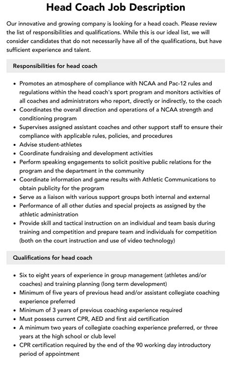Head Coach Job Description. Web head coach responsibilities coach and lead a group of 50 kids between 10 and 12 years old. Head coach (major sport) oversees all activities of a major athletic team.